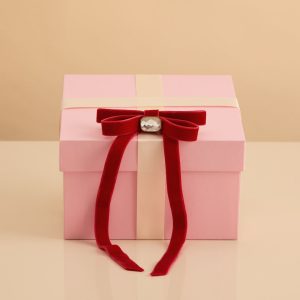 - Plush red velvet ribbon finished with a shimmering gemstone accent for the perfect festive statement.