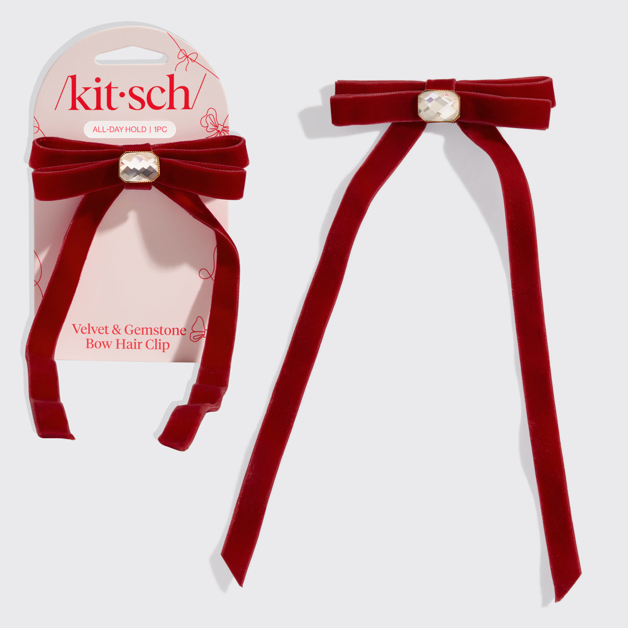 - A touch of sparkle meets timeless charm—this Velvet Gemstone Bow Hair Clip is made to stand out.